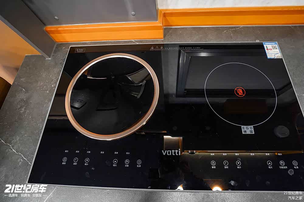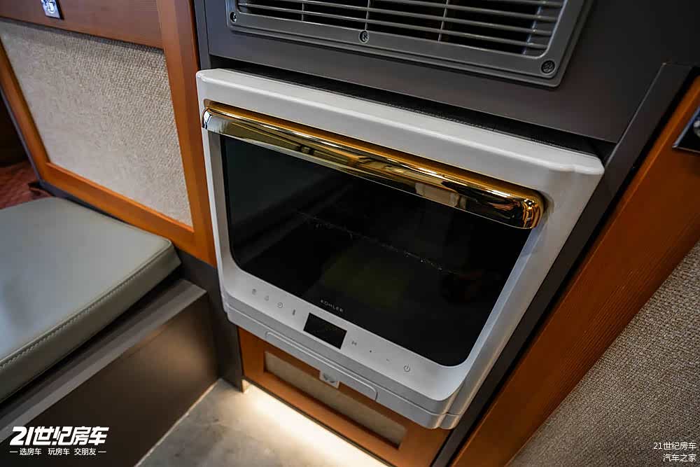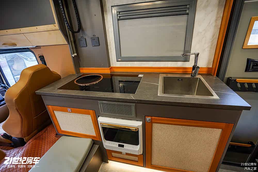 对面厨房区配置也非常齐全,岩板台面上配备双灶大功率电磁炉,高档白钢水盆+水龙头,下方科勒微波炉,上方还有多美达房车专用吸烟机,侧面翻折桌板,进一步增加操作台使用面积。