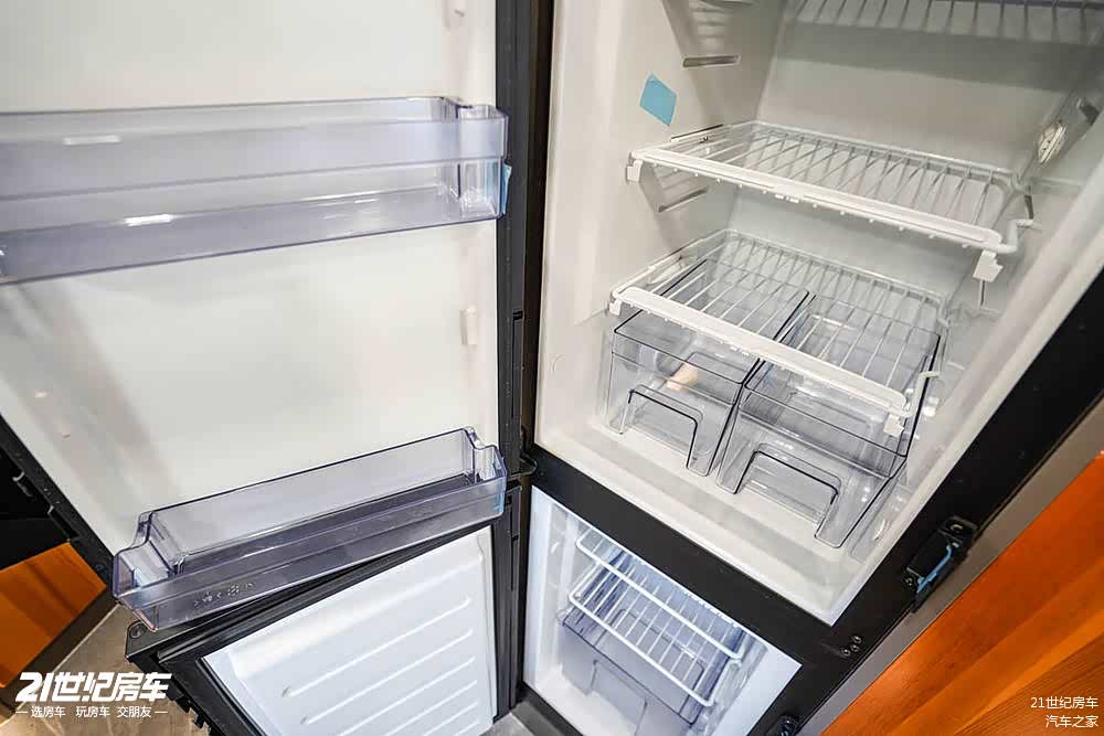 卡座沙发后方是152L赛特福德房车专用冰箱,冷冻冷藏独立分区,更方便存储食材。