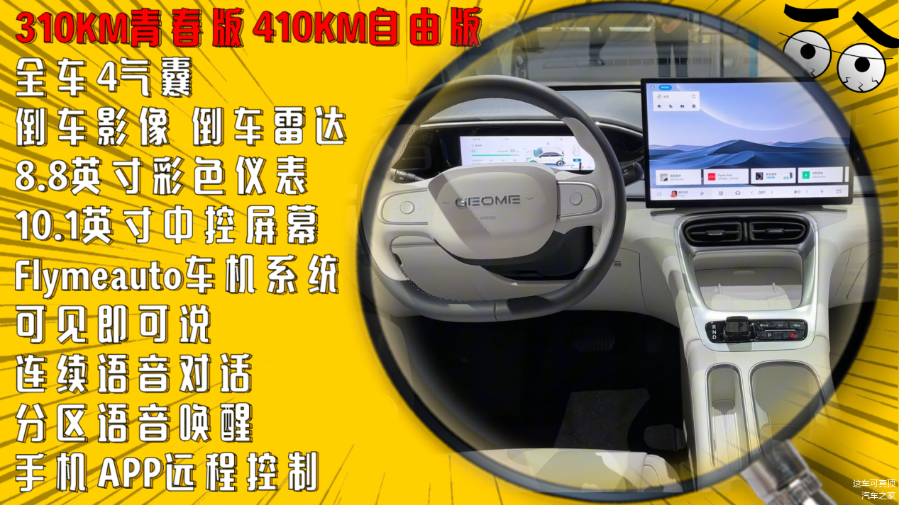 先说一下低配青春版和自由版,两款车型均配备了全车4气囊、倒车影像、倒车雷达、8.8英寸彩色仪表和10.1英寸中控屏幕,支持Flymeauto车机系统,可以实现可见即可说、连续语音对话、分区语音唤醒、手机APP远程控制等功能。功能上很基础,不过车机系统在这个价位的车型身上,算是比较智能的了。