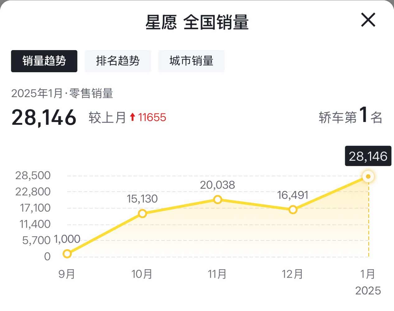 你知道吉利星愿现在有多么火爆吗?2025年1月份,吉利星愿卖了28146辆,是轿车销量排行榜第一名,前面不加任何定语!吉利星愿这款车,和比亚迪海鸥比,造型更可爱。和五菱缤果比,品牌更高端,所以颇受女性消费者的喜爱。