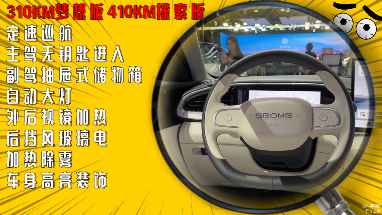 梦想版和探索版比低配车型多了十几项配置,包括定速巡航、主驾无钥匙进入、副驾抽屉式储物箱、自动大灯、外后视镜加热、后挡风玻璃电加热除雾、车身高亮装饰、化妆镜照明、后排阅读灯等功能,另外轮毂升级为16寸,中控屏幕升级至14.6英寸、大灯升级为LED光源。另外探索版还额外多了前排座椅加热功能。