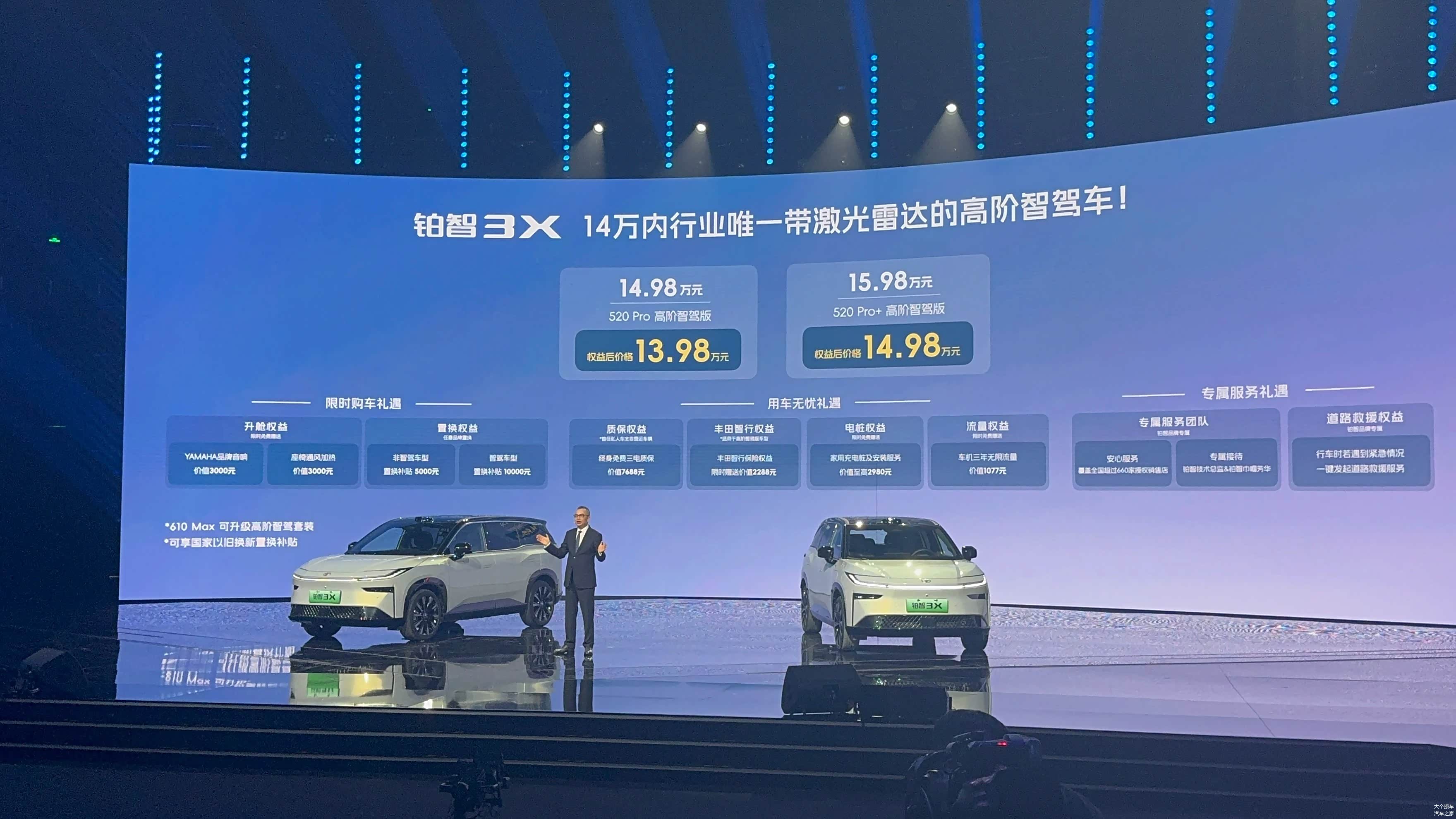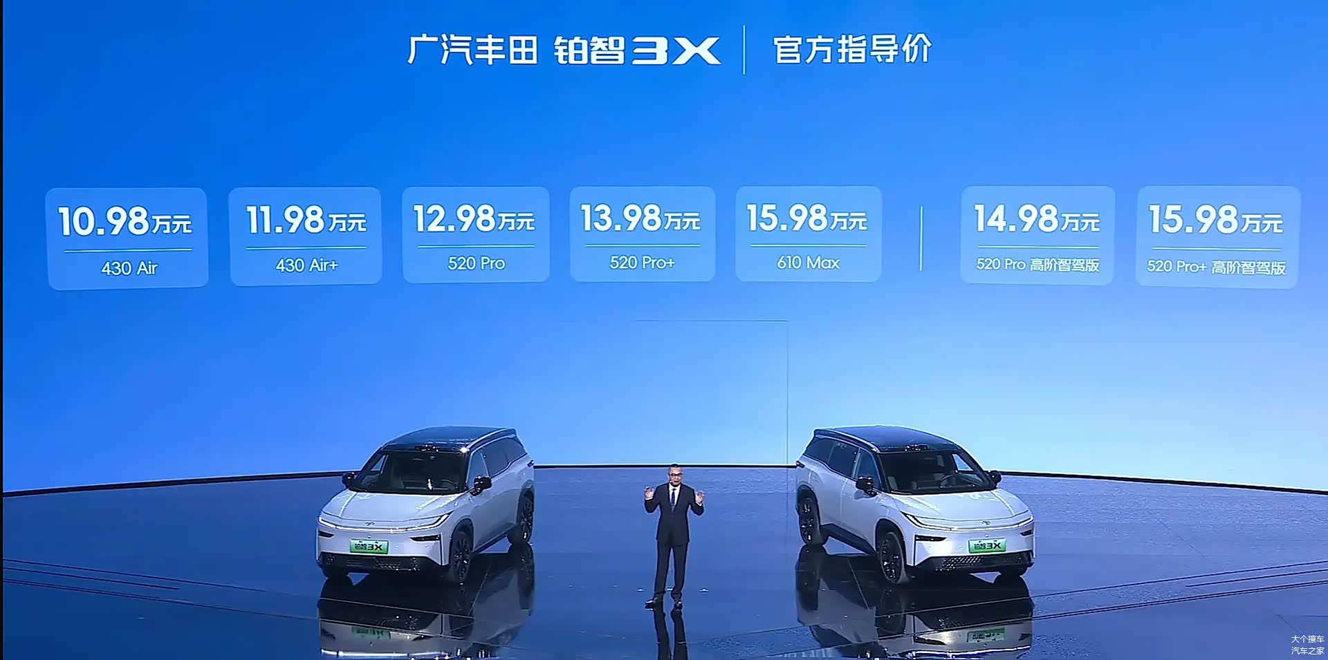广汽丰田的 铂智3X(图片 | 参数 | 询价)车型已经正式推向市场,总共推出了7种不同的车型,这些新车的售价范围在10.98至15.98万元之间。这款新车是广汽丰田推出的全新纯电SUV,定位为紧凑型SUV。它配备了最大功率为165千瓦的驱动电机,CLTC纯电续航最长可达610km。此外,这款车也是丰田首次推出端到端高阶智驾产品,能够实现全场景无图智驾的领航功能。