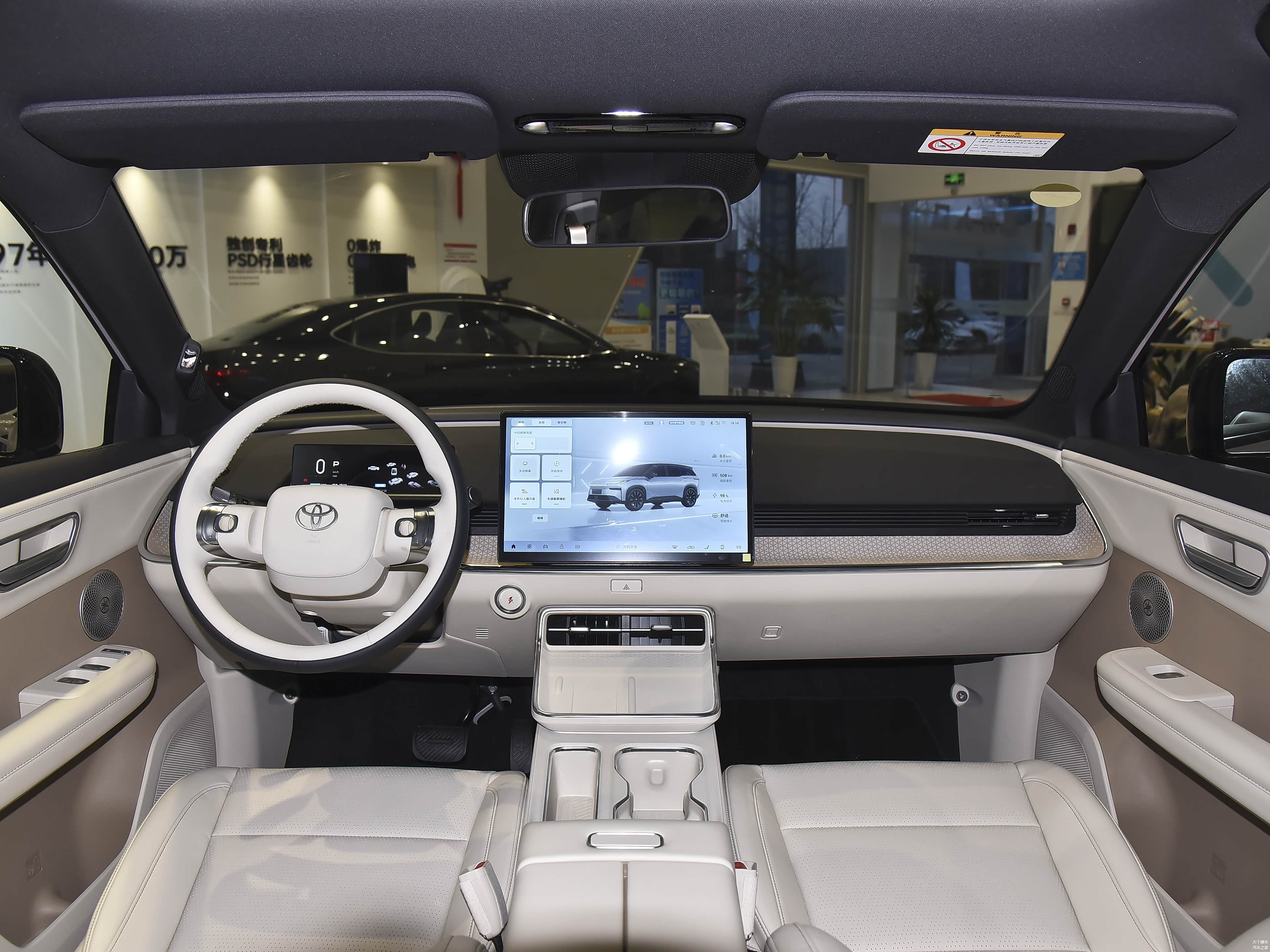 这款车的内饰设计与之前的丰田车型有所不同,它采纳了全新的设计理念,展现出一种新的风格。车内的物理按键相对较少,但配备了双辐式的多功能方向盘和电子怀挡式的换挡系统。全系标准配置包括8英寸的全液晶仪表、14.6英寸的中控屏、高通骁龙8155的座舱芯片、四音区的语音控制、前排的安全气囊、侧气囊、一体式侧气帘、ABS防抱死制动系统、ESP车身电子稳定系统、牵引力控制系统、全景影像、透明底盘、主驾座椅的电动调节、热泵空调以及后排空调出风口等。