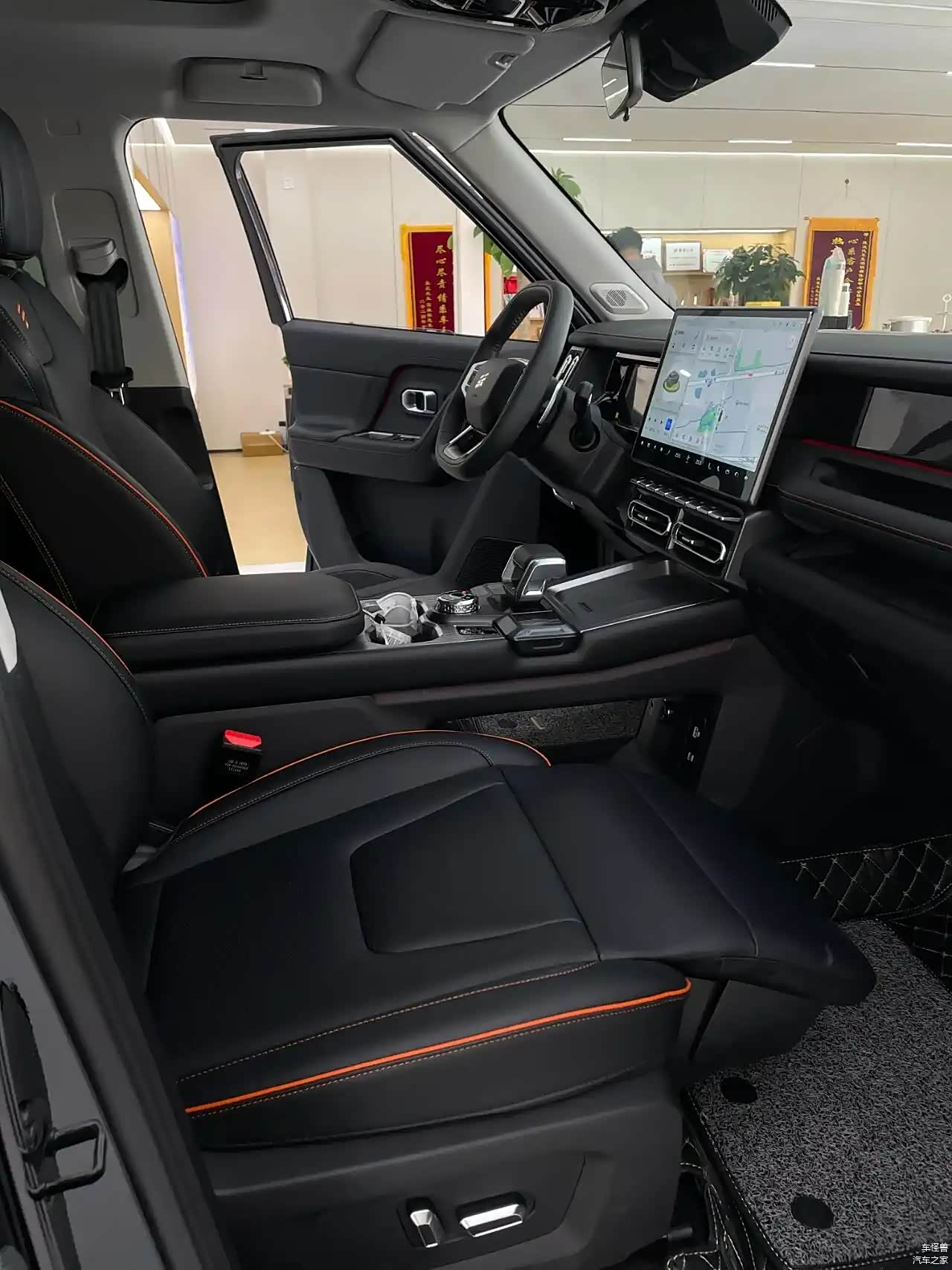 当你走进车里,你会看到许多平直的线条,这些线条与副驾驶前面的拉手、多边形的四辐式方向盘和坚固的飞机挡把相得益彰,与硬派的外观完美结合。15.6英寸的悬浮式中控大屏在左右两侧分别嵌入了10.25英寸的全液晶仪表盘和装饰板氛围灯,这不仅营造了一种科技氛围,还配备了搭载8155芯片的车载系统。此外,这里有雪山白和秘林绿等多种设计风格,再加上大量的皮质覆盖、50W的手机无线快充、水晶挡把和64色的氛围灯,整体给人一种非常豪华的感觉。