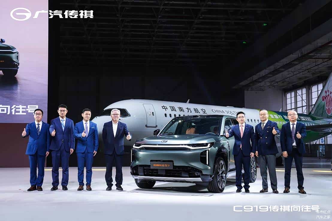 3月7日发布会现场,国产大飞机C919“传祺向往号”满载嘉宾降临,在 传祺向往S7(图片 | 参数 | 询价)、M8领航下,穿过象征民航界最高礼仪的“水门礼”,开进汽车发布会。