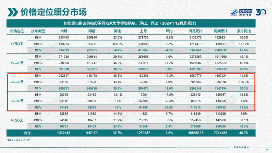据乘联会数据,2024年20-30万元价位的新能源高端车型销量为2262147辆,同比增幅高达68.3%,30-40万元级别的新能源高端车型销量为710016辆,同比增幅为11.2%。