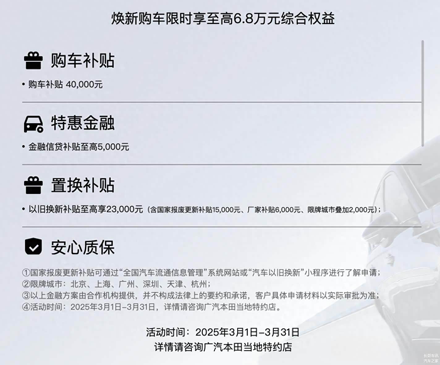近期,广汽本田针对其热门车型 雅阁(图片 | 参数 | 询价)推出了一项颇具吸引力的购车优惠活动,为潜在买家提供了高达6.8万元的综合购车权益,此优惠有效期自即刻起至2025年3月31日止,欲知详情,消费者需亲自走访当地广汽本田经销商门店咨询。以下是广汽本田雅阁及雅阁PHEV车型于本月享受的购车福利概览。