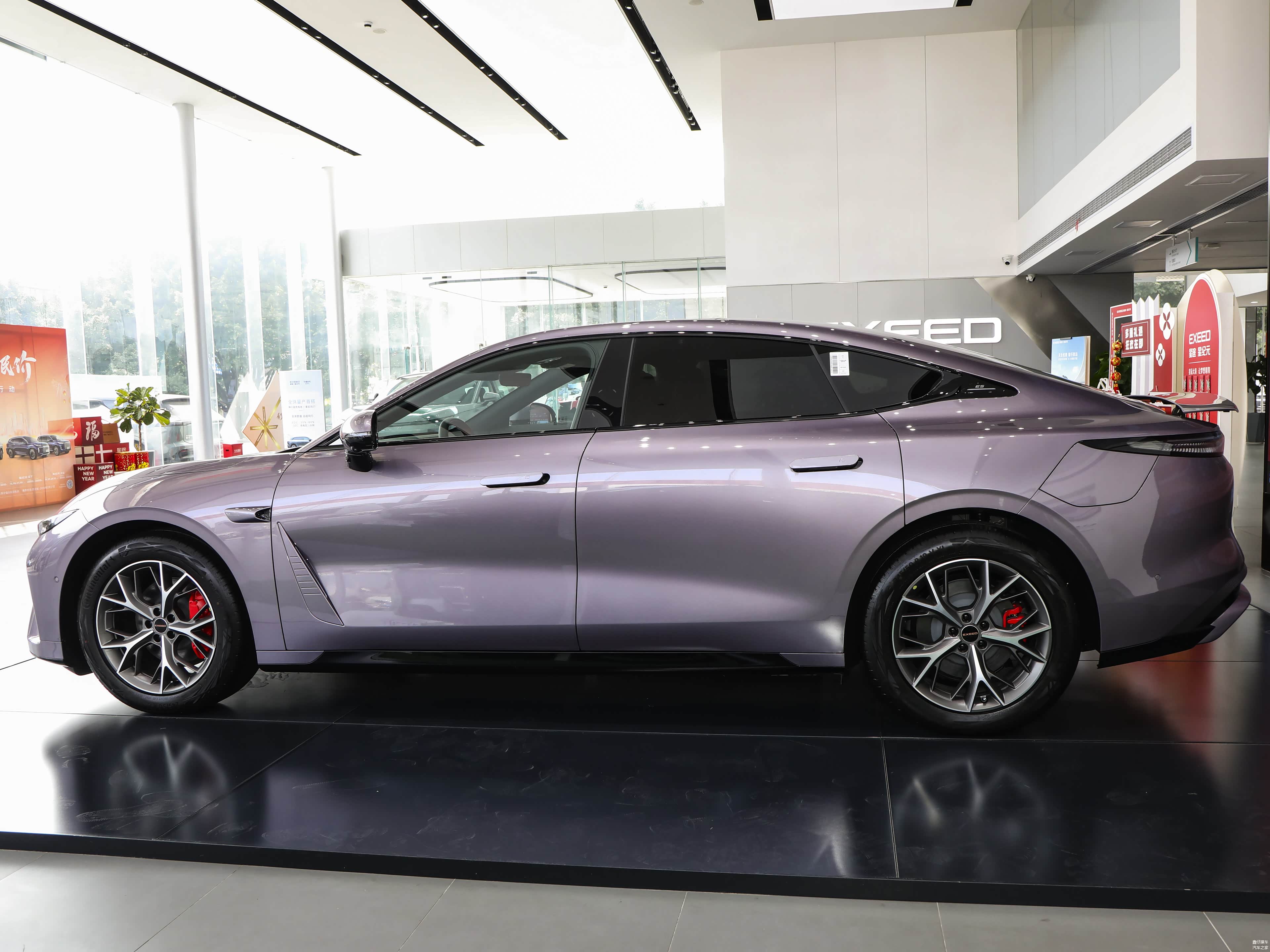车身侧面采用流畅的线条设计,大尺寸双色轮圈与红色刹车卡钳相结合,呈现运动氛围。车顶配备激光雷达,结合双英伟达DRIVE ORIN智驾芯片和猎鹰智驾系统,优化驾驶辅助功能。