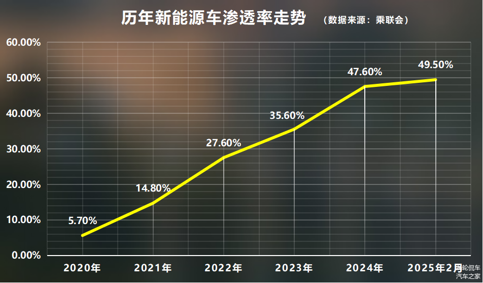 根据乘联会公布的数据显示:2025年2月份,国内新能源车的渗透率达到了49.5%,这意味着,每100个买车的人里面,就有49个人选择了新能源车,而这个数字在5年前,只有可怜的5.7%。