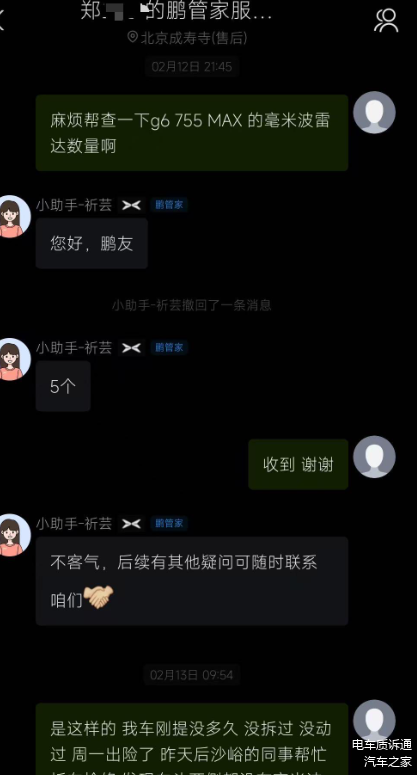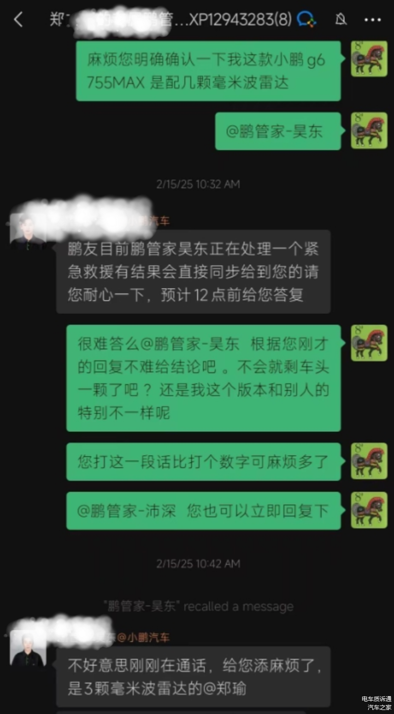 根据车主的陈述,这辆小鹏G6在购买时,销售所提供的介绍和用户手册均明确指出配置有5个毫米波雷达,其中车头3颗,车尾2颗。车主于2024年12月29日提车,但在2025年2月12日维修时发现车头两侧均未安装毫米波雷达。随后,车主与小鹏汽车的售后服务部门取得了联系,此时销售却改口称目前车辆仅配置了3颗毫米波雷达。