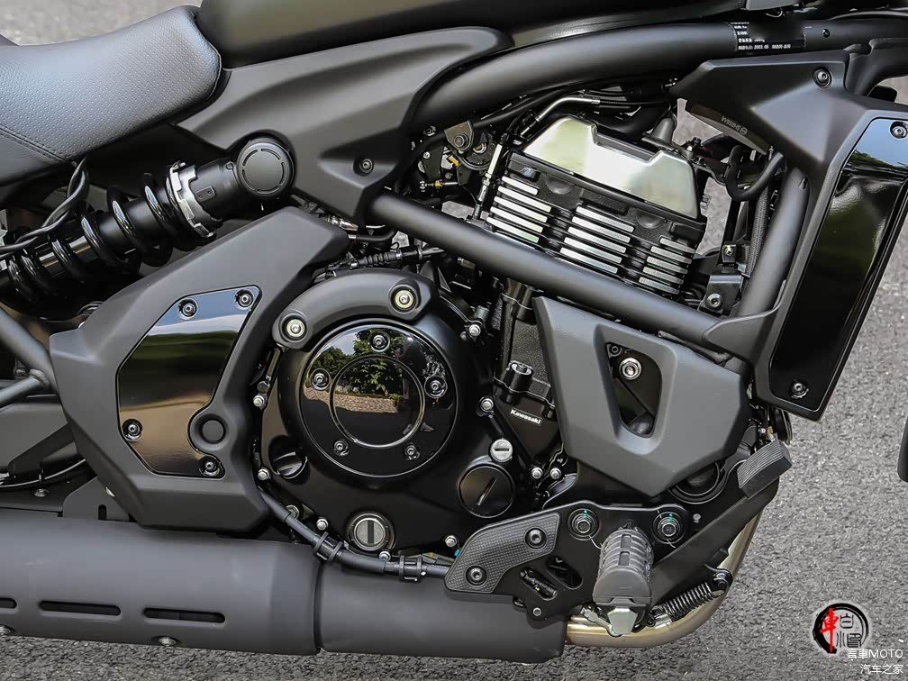 Vulcan S动力系统搭载源自Ninja 650平台的直列双缸水冷四冲程发动机,实际排量为649cc,采用DOHC 8气门结构。针对巡航特性调整了动力曲线,最大马力61.2匹,7500转时输出45kW最大功率,6600转释放63Nm扭矩,低转速区间动力响应直接。匹配6速变速系统,设定兼顾城市通勤与高速巡航,五挡时速90km/h时转速维持在5000转左右。湿式多片离合器操作力度较轻。链条传动系统维护便利,同时也强化了中低速域的加速能力。