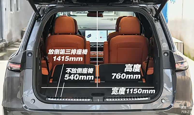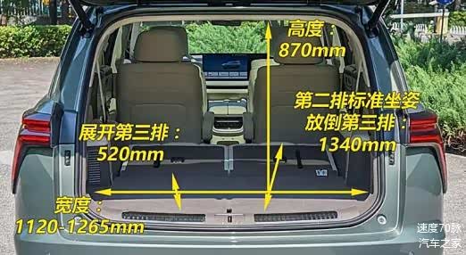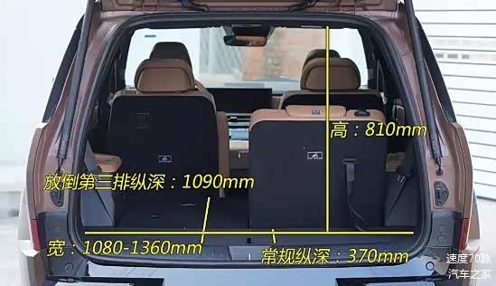 在不放倒第三排的情况下,蓝山智驾版后备厢能放入一个 28英寸和一个20英寸的行李箱。将第三排放倒后,后备厢 容积能进一步拓展,而第二排座椅不支持放倒。