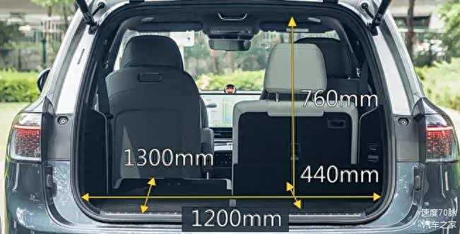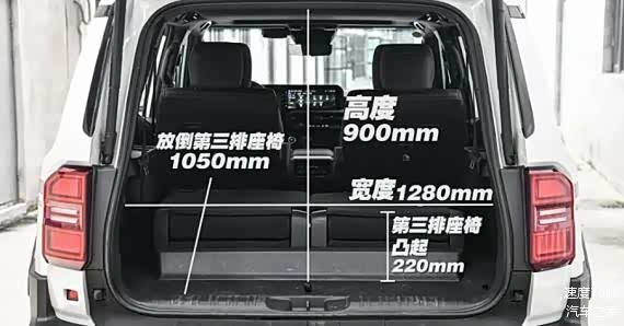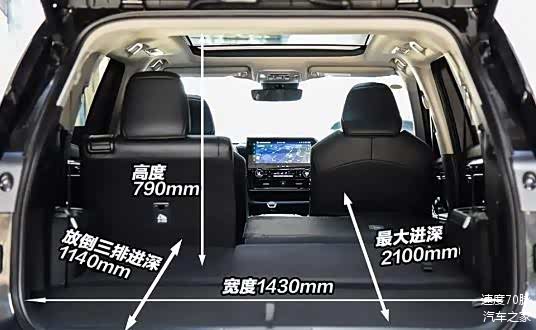 不放倒第三排座椅的情况下,后备厢的标准进深仅为450mm, 装载空间很小,但拓展后能达到2100mm,而且将全部座椅 放倒后,大家几乎可以得到一个全平的储物空间。