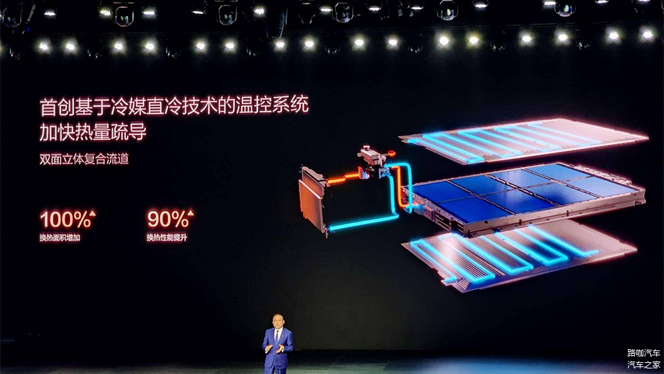 比亚迪这次的闪充电池,正负极材料上没有太多调整,还是以常规铁锂和石墨为主,解决锂离子迁移速率还是从隔膜上实现的,发布会上比亚迪没有透露具体的技术细节,但是在整个电池倍率的基础优化策略上,和宁德时代造5C麒麟电池较为类似,1000A电流产生的热量,通过冷媒直冷双面散热,根据官方给出的电池包图片,33排8个模组,大概能推算出使用了264颗短刀电芯,单体电芯标称电压可以做到4.1V,峰值电压4.5V,200多节就能适配1000V高压平台。