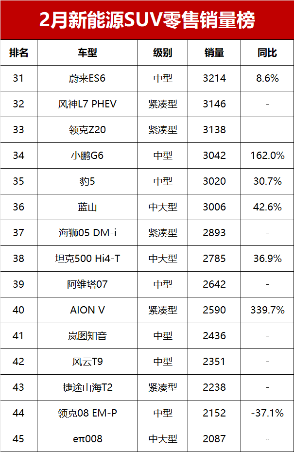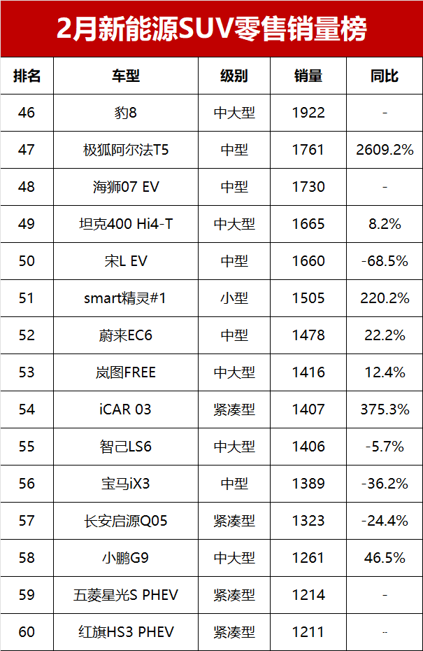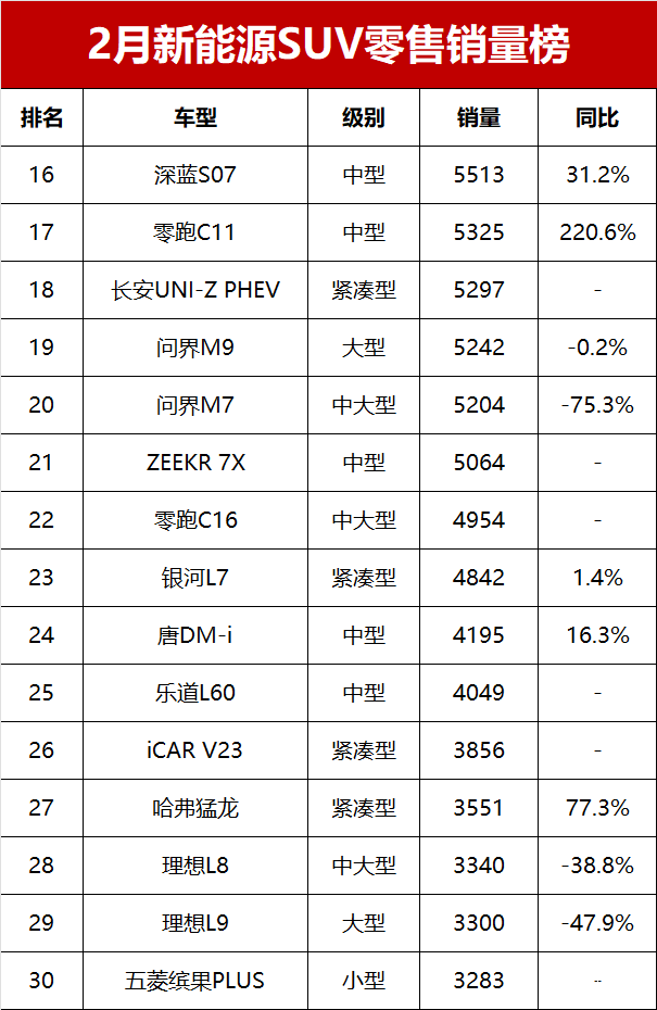 而在中型SUV上,2月份宋L DM-i和零跑C10销量分别为8555辆和8054辆,排名第九和第十位,新车凭借高性价比与品质提升赢得认可。深蓝S07和零跑C11销量分别为5513辆和5325辆,排名第十来和第十七位。