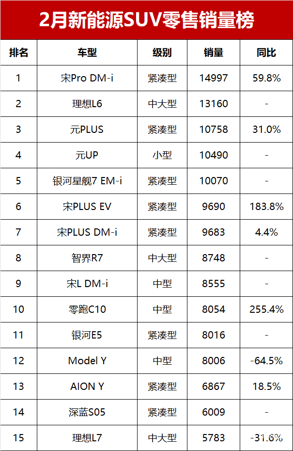 从销量前五车型来看,比亚迪宋pro DM-i以14997辆荣登2月新能源SUV销量榜首,同比劲增59.8%。比亚迪深耕混动技术,赋予它出色的燃油经济性与动力,性价比极高,满足通勤与长途出行需求。同样来自比亚迪的 元PLUS(图片 | 参数 | 询价)、元UP排名第三和第四位,2月零售销量分别为10758辆和10490辆。这两款新车凭借时尚外观、丰富科技配置及比亚迪成熟三电系统,深受年轻消费者欢迎。