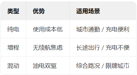 首先,我们要知道目前的新能源汽车有三类,纯电、增程、混动三种动力形式,大家可以根据自己的使用场景去选择,仅是城市代步,长途出行少,就可以选择纯电.增程和混动都可以满足长途出行,但有些城市对增程车没有绿牌福利,消费者就要根据所在城市地方政策去选了。