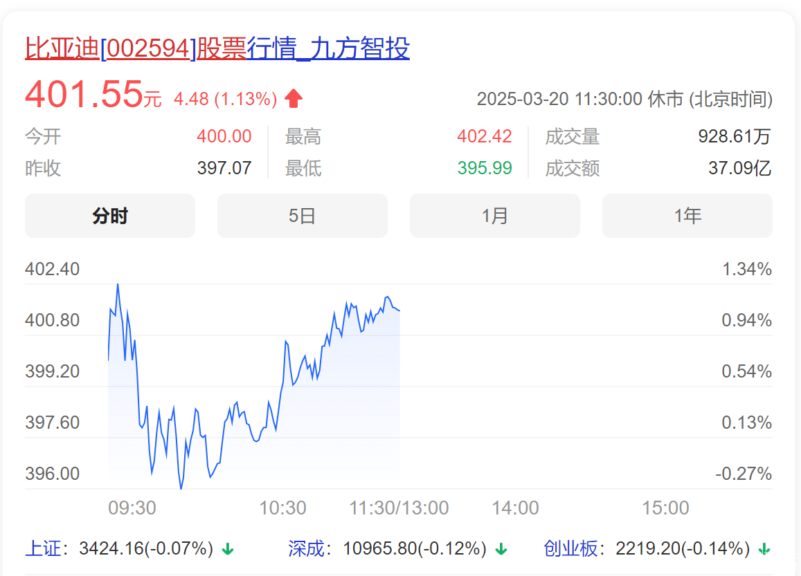 3月17日,比亚迪又推出跨时代超级e平台,以兆瓦闪充开启「油电同速」时代,1秒2公里,5分钟补能400共公里,从此加油和充电一样快,不仅是充电快,还有全球首款量产3万转电机 ,突破电动车性能极限。然后我这2天又看了下比亚迪股票,从380多涨到400了。。。