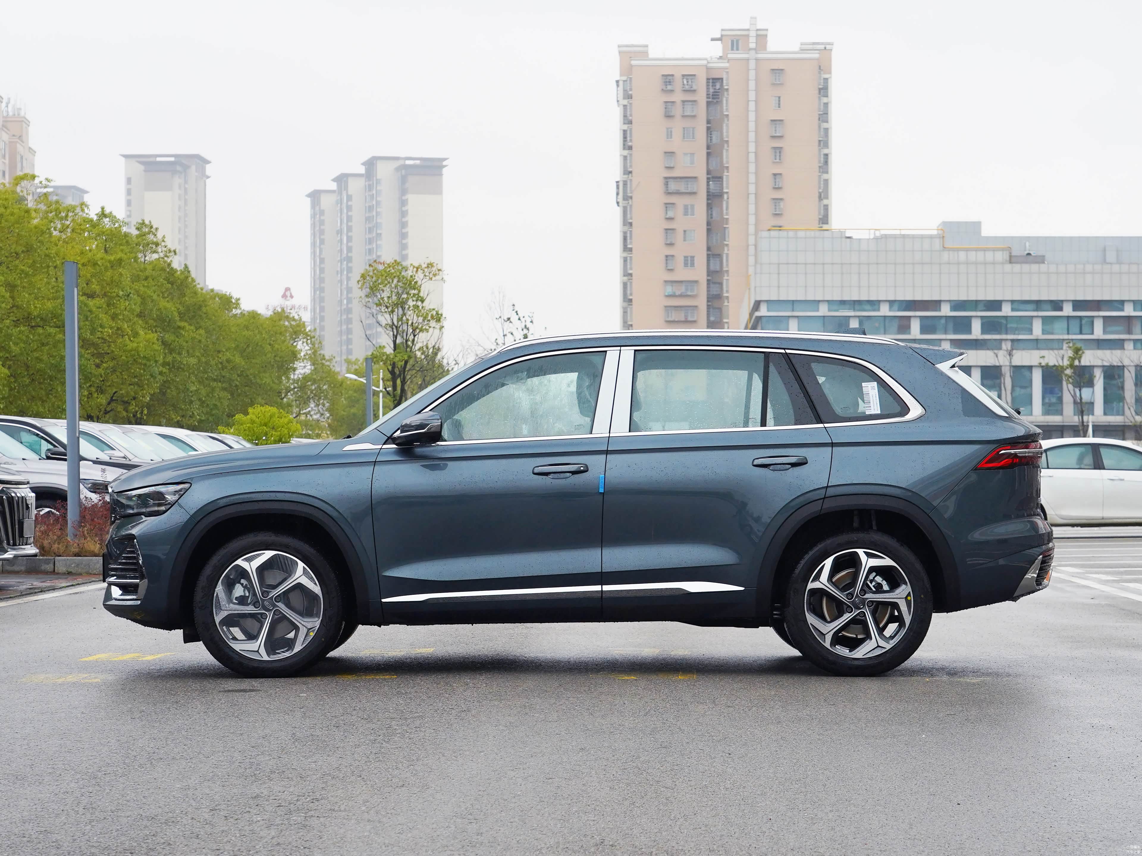 侧面造型方面,车顶略带一点弧度,配备有粗壮的行李架以及鲨鱼鳍,有着比较强的力量感;腰线采用了贯穿式设计,从前翼子板延伸到车尾,让视觉效果显得修长大气;轮眉和侧裙部分设计有粗壮的黑色饰板,凸显了力量感;轮毂采用了五辐式花瓣造型,风格显得比较大气。