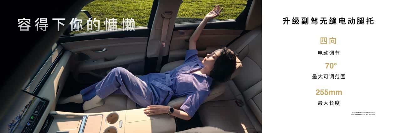 而在乘坐体验上,新车副驾升级无缝四向电动腿托,最大角度可达70°,最大长度255毫米,搭配可调色温化妆镜,提升副驾的舒享体验。全系标配10层结构的舒云座椅,前排支持加热/通风/按摩功能,后排配备双HUAWEI Maglink,拓展交互体验。