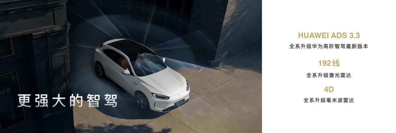 值得一提的是,新车在高阶智驾层面也有大幅升级,全系标配HUAWEI ADS 3.3,升级192线激光雷达与4D毫米波雷达,车位到车位全场景贯通,并拥有全场景泊车能力,其中VPD泊车代驾(beta)支持自主漫游找车位,离车泊入功能。动态表现层面,新增升级舒适制动功能,优化刹车平顺性和刹停俯仰感,平顺性提升81%。