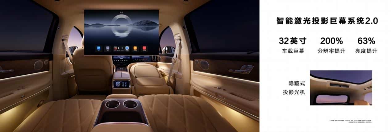 而在舒适性体验上,问界M9延续了其一贯优势,全系标配舒云座椅,升级双绗缝工艺,主驾座椅升级电动可伸缩坐垫,五座车型后座新增零重力座椅套装可选;六座版主驾二排座椅升级电动腿托。新车两侧后排升级智能隐私车窗,支持4档透光度可调,大幅提升隐私保护。而新的激光投影巨幕2.0则带来更震撼观影体验,32英寸投影分辨率提升200%,亮度提升63%,并首创车载悬浮窗,一屏多用。