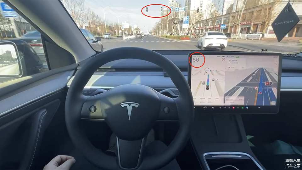 改进优化的点,还包括了更柔和的制动、较早的变道机制、加塞丝滑,重点来讲依然存在的几个问题。首先,相较于早期效果,限时体验的FSD版本,闯红灯几乎没有再发生,但百度地图提供的红绿灯倒计时数据信息,FSD似乎并没完全参考,比如,极限闯黄灯就时有发生,信号灯在已切换为黄灯时,FSD并没有让速的打算,而是以匀速或小幅提速驶过路口,这其实是存在安全隐患的,不过,结合40多公里的北京晚高峰市区实测体验来看,绿灯尚有10秒左右结束,且前方无跟车的条件下,FSD又可以准确识别到,并且在道路划线内稳稳刹停,不出意外,黄灯问题会是接下来FSD小幅改进的内容。