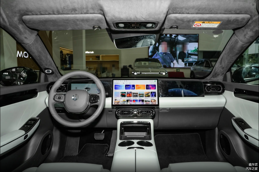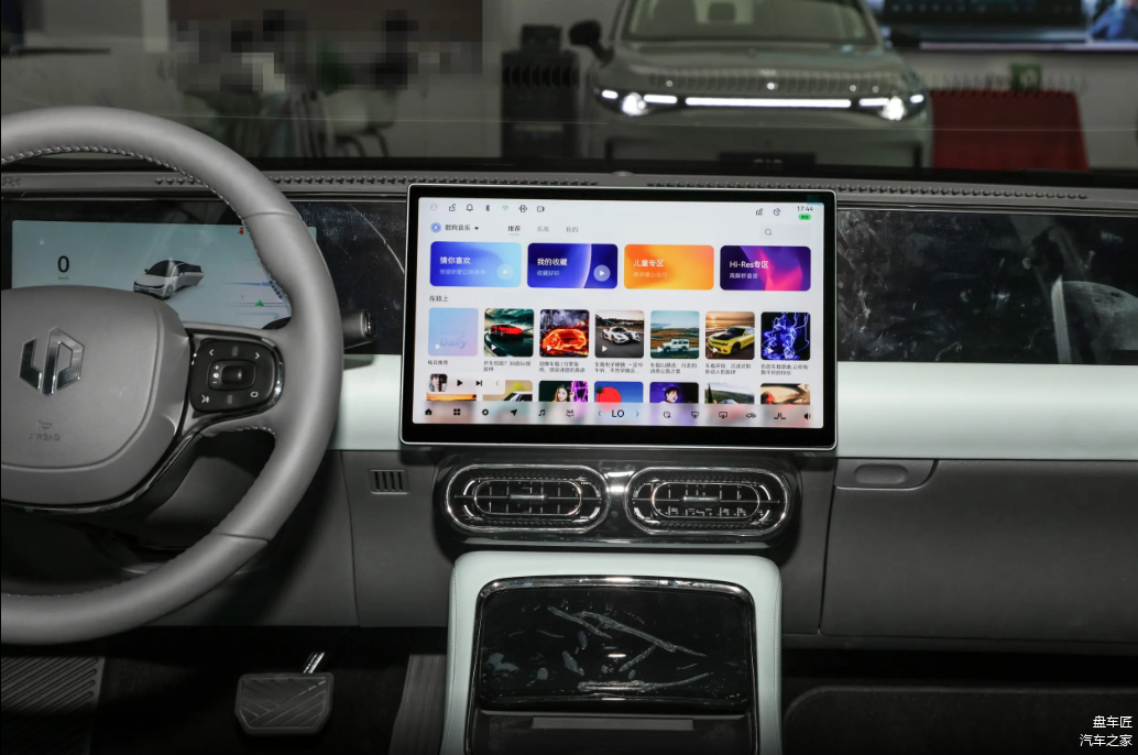 配备10.25英寸全液晶仪表,显示效果十分细腻,界面UI也比较清爽、默认界面左、中、右分别为导航界面、驾驶辅助以及多媒体系统,最下方会分别显示电量和油量续航,一目了然。而12.8英寸中控触控屏幕,车机系统界面十分清爽,且操作比较流畅。副驾驶位配有10.25英寸娱乐屏,可独立控制车内的多媒体娱乐系统、内饰氛围灯、座椅调节及按摩等功能。