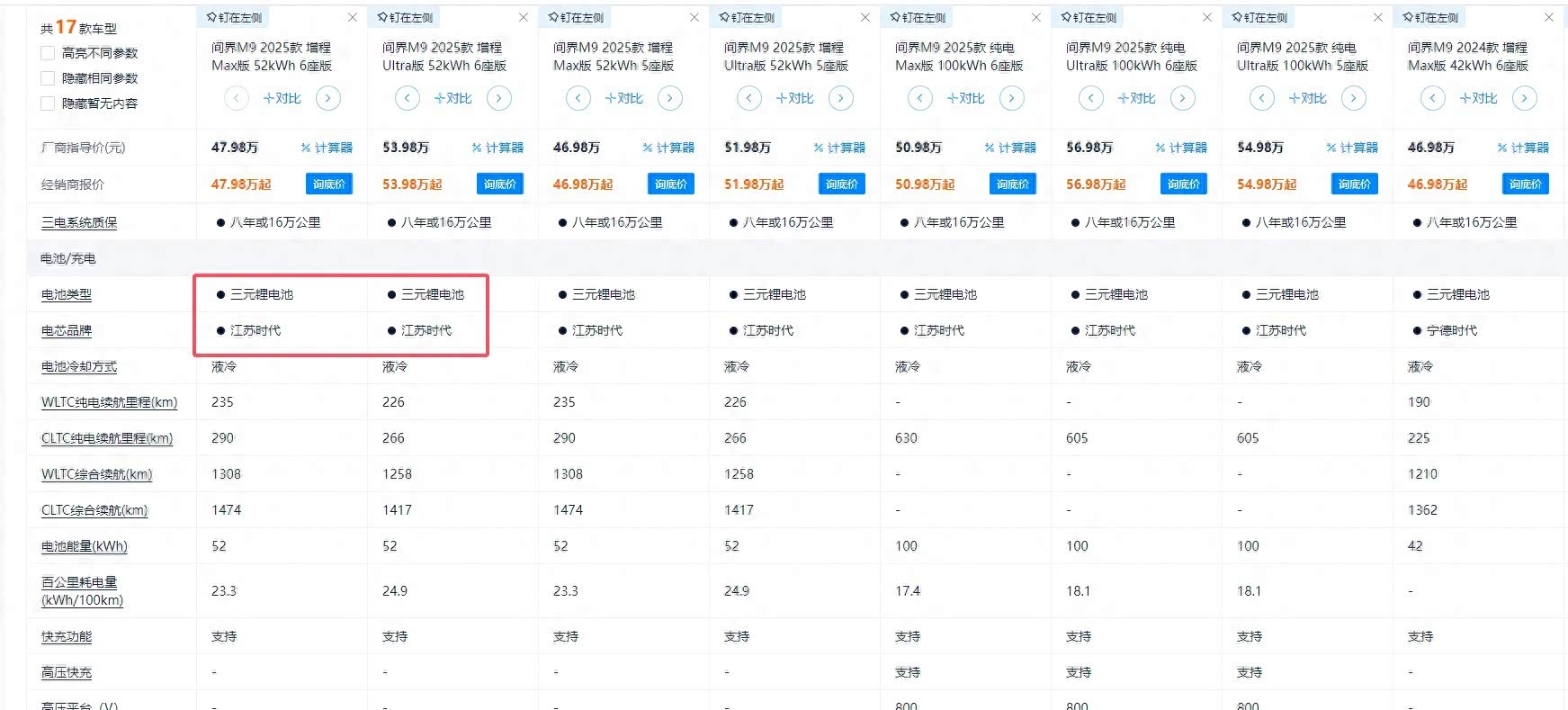再然后,就是三元锂电池,还能实现更加高效的充电速度,我们直接看问界M9的参数度,增程版52度电池包,最快能0.5个小时就能充满,哪怕是慢充也可以在6个小时内充满,而纯电版100度的电池包,搭载了800V的高压快充技术后,充电速度更是能达到0.25个小时充满,慢充也一样能达到11.7个小时内把电池充满的。