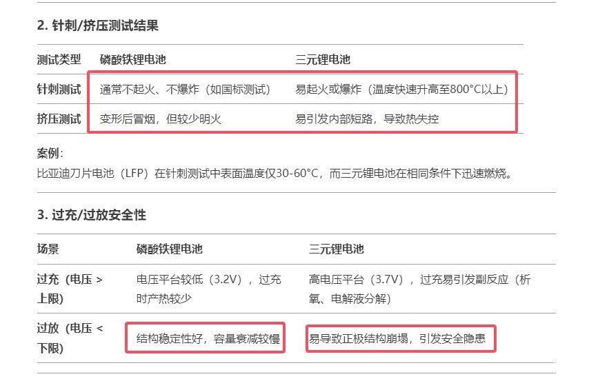 而且根据《中国汽研(CAERI)电池安全测试报告》里面,曾经也提到过,针刺测试中,磷酸铁锂通常不起火也不爆炸,但三元锂则会出现温度飙升到800°,容易起火和爆炸的情况出现,而挤压测试中,三元锂电池更是直接出现热失控的情况,再加上过度充放电下,三元锂电池的正极结构崩塌,引发安全隐患,这些都能说明三元锂电池的坏处。