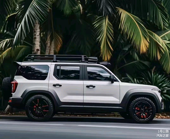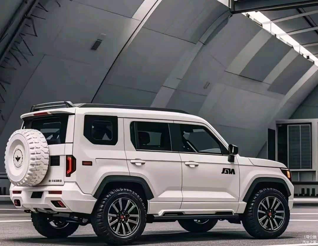 车身侧面同样采用了方盒子造型,B柱、车窗装饰条、车顶行李架、后视镜以及前后轮眉和踏板等细节均进行了黑化处理,与白色车身形成了鲜明的撞色效果。一条平直的腰线贯穿前后,侧裙处则采用了内凹式设计,并辅以更加硬朗有力的线条点缀,整体视觉效果越野感十足。
