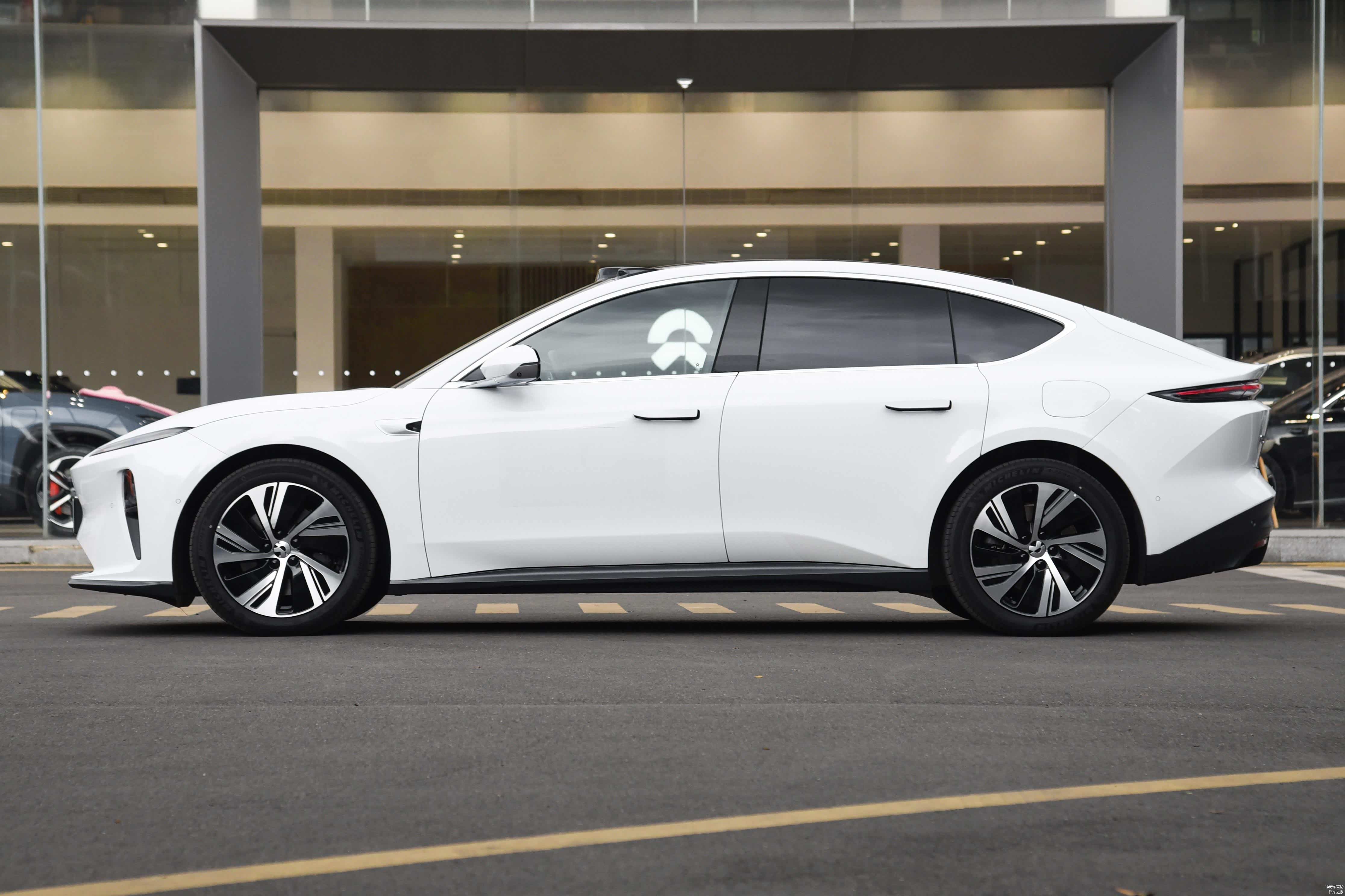 蔚来 ET5 侧面延续轿跑车型的低趴姿态,车身尺寸为 4790×1960×1499mm,轴距达 2888mm,配合 19 英寸铝合金轮毂(轮胎规格 245/45 R19),营造出宽体低重心的视觉效果。溜背式车顶线条从 B 柱开始快速下滑,与小鸭尾扰流板衔接,既优化空气动力学(风阻系数 0.24Cd)又强化运动感。无框车门搭配隐藏式门把手,闭合后与车身形成连续曲面。贯穿前后的双腰线设计:上腰线从前翼子板延伸至尾灯,下腰线在车门处内凹,配合车门底部的立体筋线,增强光影层次感。侧裙采用熏黑导流槽设计,部分版本可选装气辉橙卡钳(需额外选装),与车身颜色形成撞色对比。轮拱采用宽体设计,搭配五辐式运动轮毂,进一步凸显性能取向。整体来看,ET5 侧面通过紧凑的比例、流畅的曲面及细节处的空气动力学优化,兼顾设计美感与功能性。