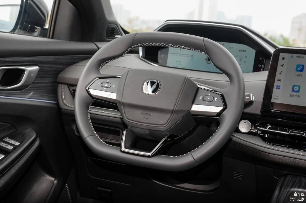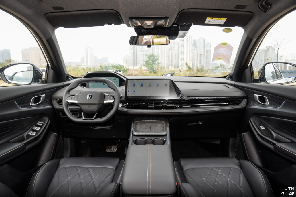 内饰部分,可以看出长安CS55PLUS PHEV的车内采用类似飞机座舱的设计,层次感非常强,内饰的用料也比较出色,软质材料覆盖了整个中控台,仪表的位置比较低,不遮挡视线。采用了一块10.25英寸的全液晶仪表,左右两侧均可自定义功能菜单,包括导航和多媒体系统都可以显示在仪表盘内,中央多媒体屏幕为12.3英寸的高清液晶显示屏,内置在线导航、QQ音乐、喜马拉雅等主流的应用。双平底方向盘的造型让人眼前一亮,也为车内营造出更多的运动气息。