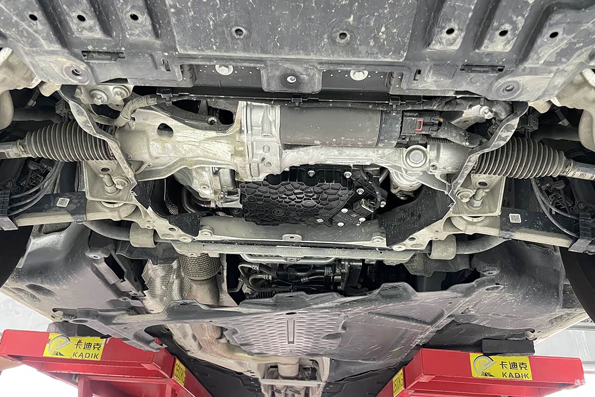 底护板拆下,检查发动机、变速箱下部,就一个问题,放油螺丝口周围有油迹,这个不一定是渗的油,也有可能是之前保养时流的没处理干净,这种当时时没法下结论的。不过不管怎样,都不算大问题,知道一下就行····