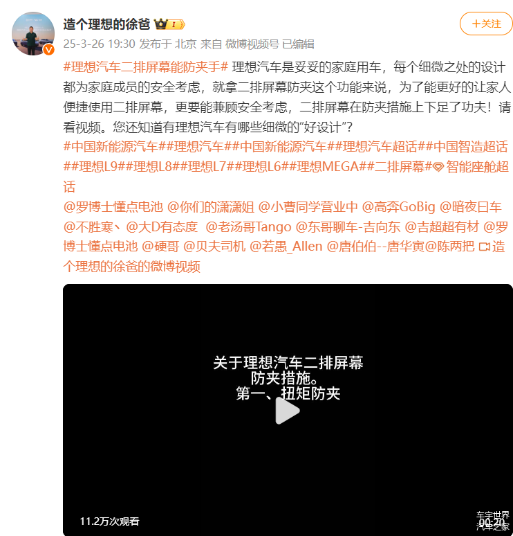 或许是担心舆论的连锁反应让同样配备后排屏幕的理想成为公众质疑的对象,理想汽车制造工程负责人“造个理想的徐爸”及产品线负责人“老汤哥Tango”迅速回应,通过技术解析与公开演示,强调“二排屏幕的防夹功能”,并强调其“家庭用车”定位下的安全设计逻辑。