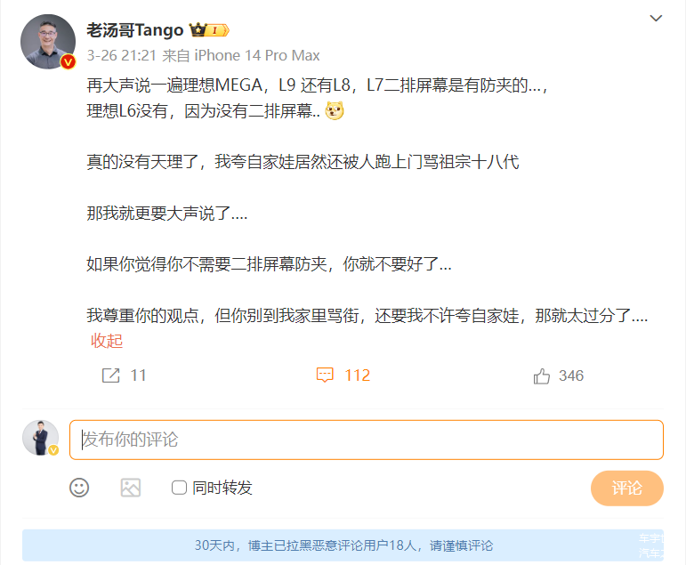 至于“老汤哥Tango”则对车型配置差异的说明,均指向理想试图通过安全技术强化其“家庭友好”品牌形象的战略。