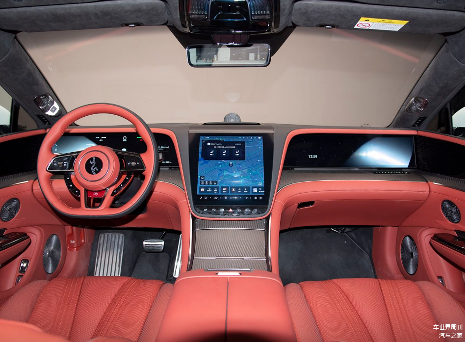 内饰方面,仰望U7搭载星环座舱,中控台采用对称式设计,匹配有12.8英寸曲面大屏、23.6英寸的液晶仪表以及副驾娱乐屏,配合AR-HUD抬头显示,营造出满满的科技感和时尚感。细节部分,新车还加入多处镀铬元素以及碳纤维/枫木饰板,搭配双拼配色方案,令整个内饰更具精致感和豪华感。
