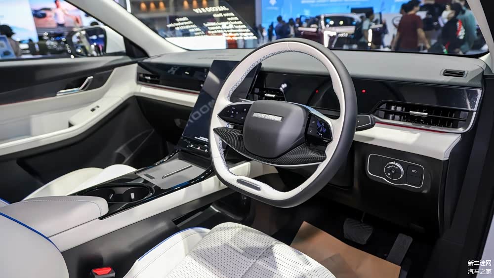 内饰配置:车内配备10.25英寸全液晶仪表盘和15.6 英寸中控屏,支持智能互联系统。采用黑色和白色双色调装饰。