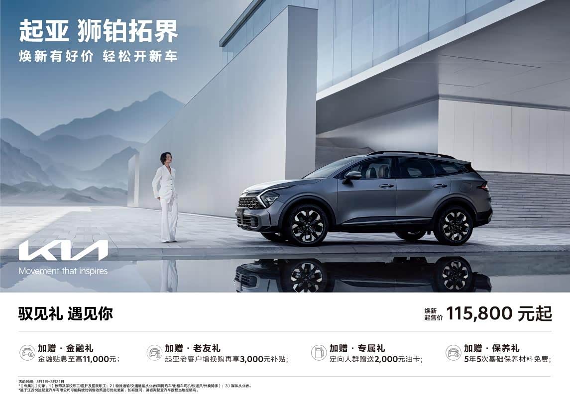 目前,悦达起亚推出了三月超值购车钜惠,购买狮铂拓界即可享焕新起售价11,5800元起,还可享金融贴息至高11,000元、起亚老客户增换购再享3,000元补贴、定向人群赠送2,000元油卡,以及5年5次基础保养材料免费等专享权益。