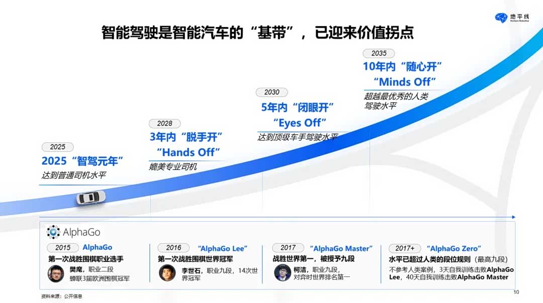 余凯认为,回顾手机发展历史,智能汽车时代智驾的角色就类似手机基带。地平线认为今年将是「智驾元年」,智驾将达到普通司机的水平;而在 3 年之内,可以实现「脱手开」,智驾水平媲美专业司机;在 5 年内,将实现「闭眼开」,智驾将达到顶级车手驾驶水平;在 10 年内,将实现「随心开」,智驾水平超越人类。