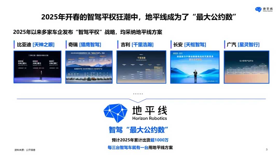 余凯谈到,今年以来行业掀起了「智驾平权」浪潮,奇瑞、吉利、长安、广汽等车企纷纷发布相关产品,而地平线要么是唯一的供应商,要么是唯二的供应商。