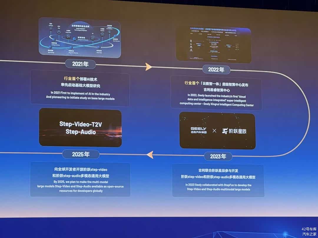 在大模型开发方面,吉利在新能源转型之初就同步开始布局了 AI 大模型的开发团队建立,吉利联合阶跃星辰开始进行多模态通用类大模型,联合参与阶跃 Step—Video 和 Step—Audio,均为多模态通用类大模型,可以实现语音类和视频类内容生成。同时,吉利也将阶跃的多模态通用大模型和吉利的星睿垂类大模型相结合,使车内交互更丰富。