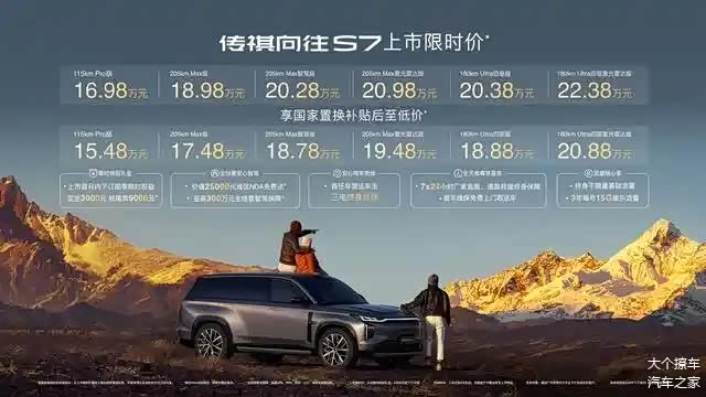 此外,广汽传祺向往S7的2025款产品还规定了“上市首月的限时价格”(到4月30日为止,定金3000元可以抵扣尾款9000元)在16.98-22.38万元之间;“国家置换补贴价”的范围是15.48-20.88万元。【详情请咨询当地经销商】