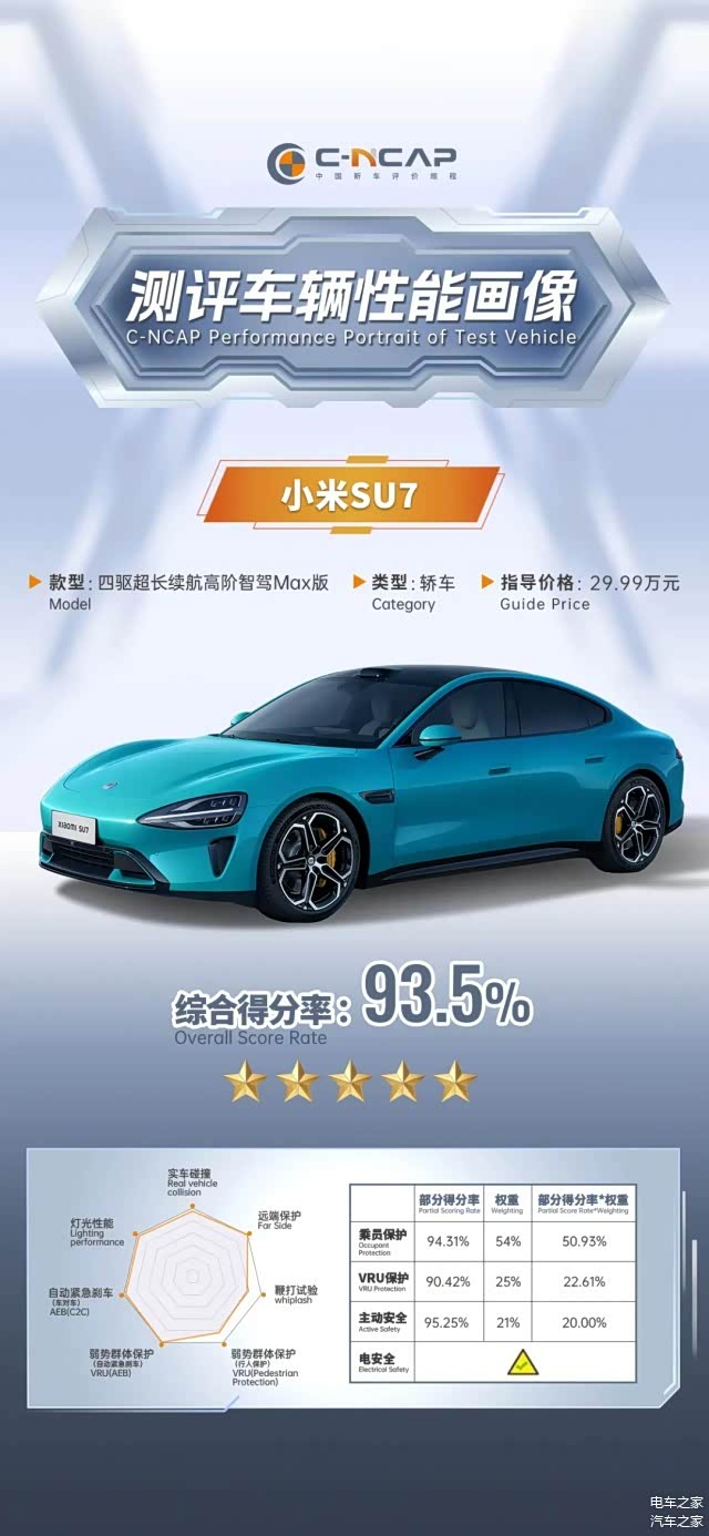 值得注意的是3月25日,中汽测评公布了小米SU7的C-NCAP测试成绩,其获得了五星评价,综合得分率93.5%。其中,乘员保护得分率为94.31%,VRU保护得分率为90.42%,主动安全得分率为95.25%,均超过已测车型平均得分率。