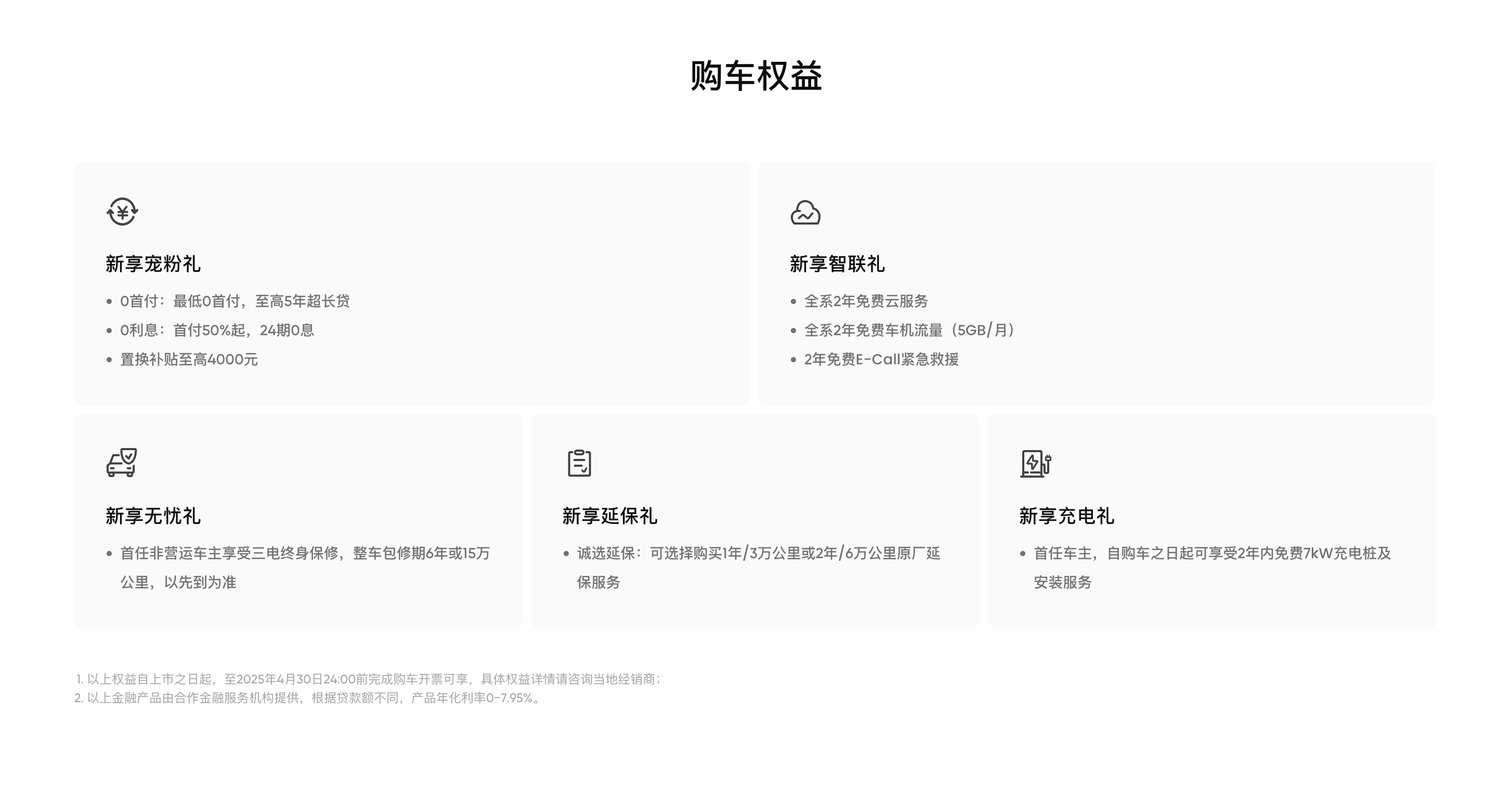 购车权益:目前厂家官方给出的购车权益是截至2025年4月30日,可享0首付、24期0息、至高4000元置换补贴等政策,进一步降低入手门槛。建议大家根据自己实际用车场景和预算,试乘试驾体验后再做决策。