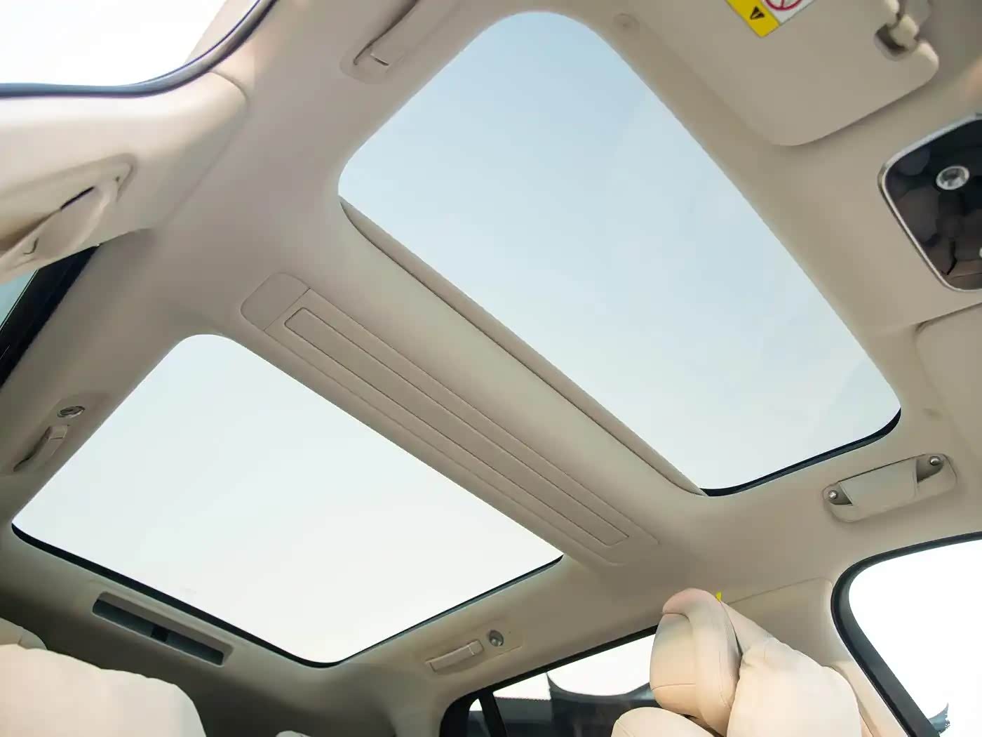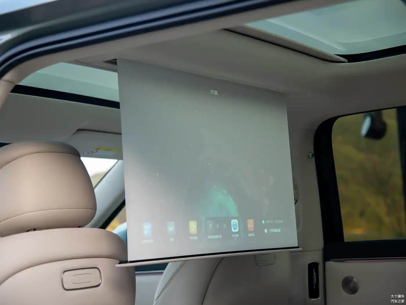 分体式天窗设计考虑了安全性、美观性和良好的采光效果,而后排的投影设备则使用了尺寸更小的激光装置,这样就可以轻松地嵌入车体内部,进出第三排时无需担心头部碰撞的问题。顶棚所使用的覆盖材料是布料制成的,与问界M9品牌的麂皮相比并不那么高档,但你可以额外选择购买。