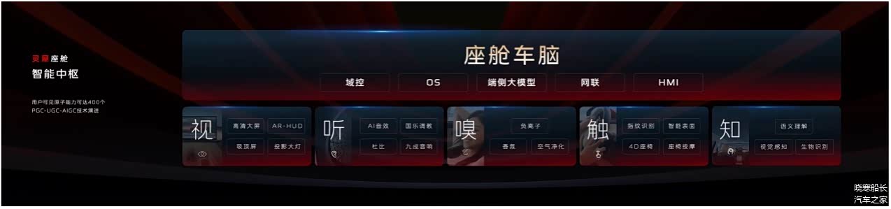 视觉就是车机屏幕、HUD、投影等,听觉就是车载的音频,触觉包括了智能便面、4D座椅等,嗅觉就是车内的香氛系统,负离子空调等,知觉则是车载AI系统可以理解用户说的指令,同时还有视觉算法对车内的感知等。