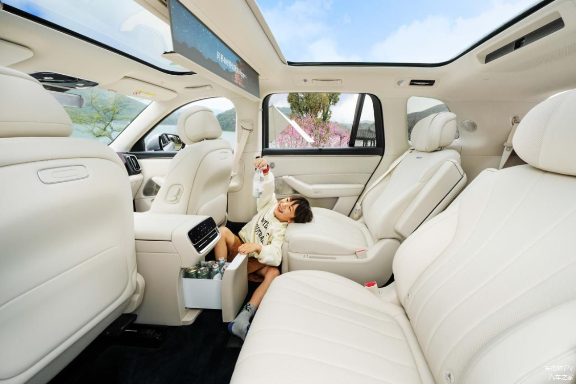 新车座椅主驾标配加长腿托、副驾提供芭蕾折叠双享座椅,六座版右后标配零重力座椅,五座版右后搭载准零重力座椅。此外,新车的车载投影系统进化到2.0版本,并支持四分之一悬停,对于户外出行、露营等用车场景,更加友好!
