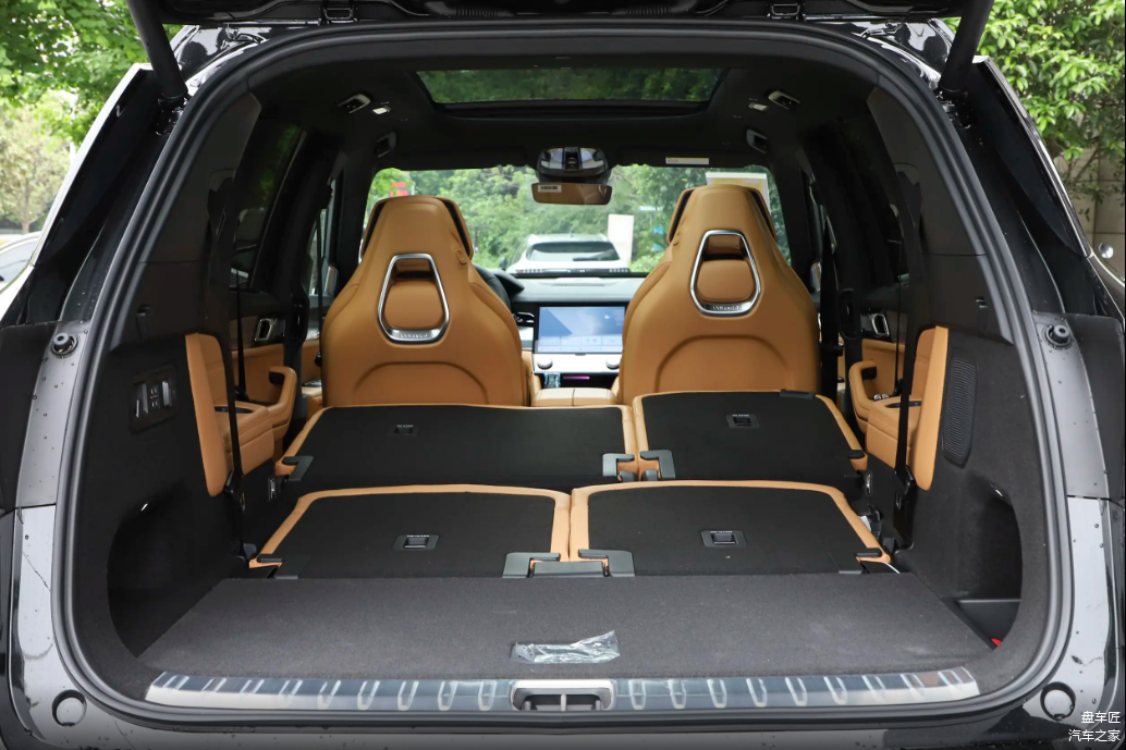 后备厢方面,可以通过C柱内侧和行李厢内部的电动调节按键来控制第三排座椅的收折和开启,收起第三排座椅后,行李厢地板能够保持纯平的状态,但由于第二排座椅采用电调方式,所以并不支持放倒。不过将第三排座椅放倒后,行李厢容积已经相当可观了,最大纵深超过2米,虽然跟地板有一定角度倾斜,但并不影响放置超大件物品,容纳三口或四口之家长途出行的行李和物品是完全没有问题的。