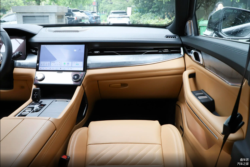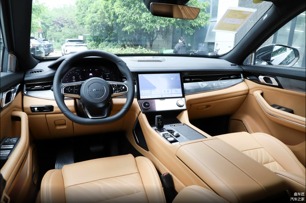 内饰部分,可以看出车内采用极简的设计风格,相比时下流行的连体大屏,领克09的布局相对传统,对于一些用户来说接受可能更高,整个中控由大尺寸液晶仪表+HUD抬头显示以及悬浮式中控大屏组成,豪华感和科技感的呈现在同价位车型中属于主流水平。在细节的处理上,领克09不仅采用了镀铬工艺的按键,还有铝饰板加上大面积真皮包覆,可谓触手可及皆豪华,搭配上64色氛围灯更加有档次感。